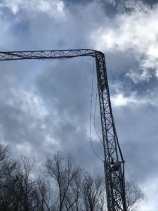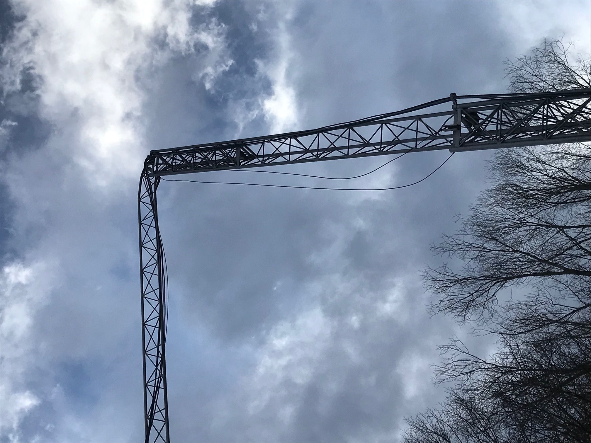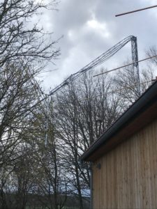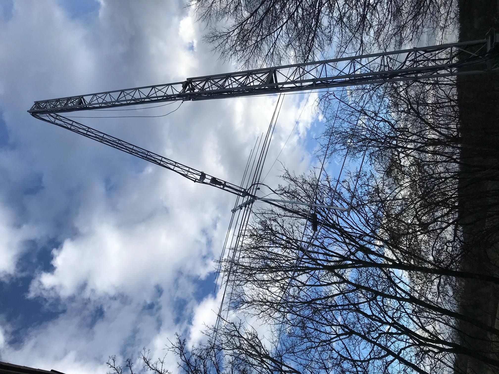 Der oberste Schuss unseres Versa-Towers wurde Richtung der südlich gelegenen Bäume abgeknickt und dabei wurden alle Antennen, der LZ-Beam, der 30/40m drehbare Dipol, der 2m Beam und die Antenne für DB0OVL, zerstört. Der am Mast befestigte 80m Dipol ist demzufolge natürlich gerissen, einzig die 160m L-Antenne scheint nach der ersten Inaugenscheinnahme überlebt zu haben. Dieser fehlt nun aber der Aufhängungspunkt.