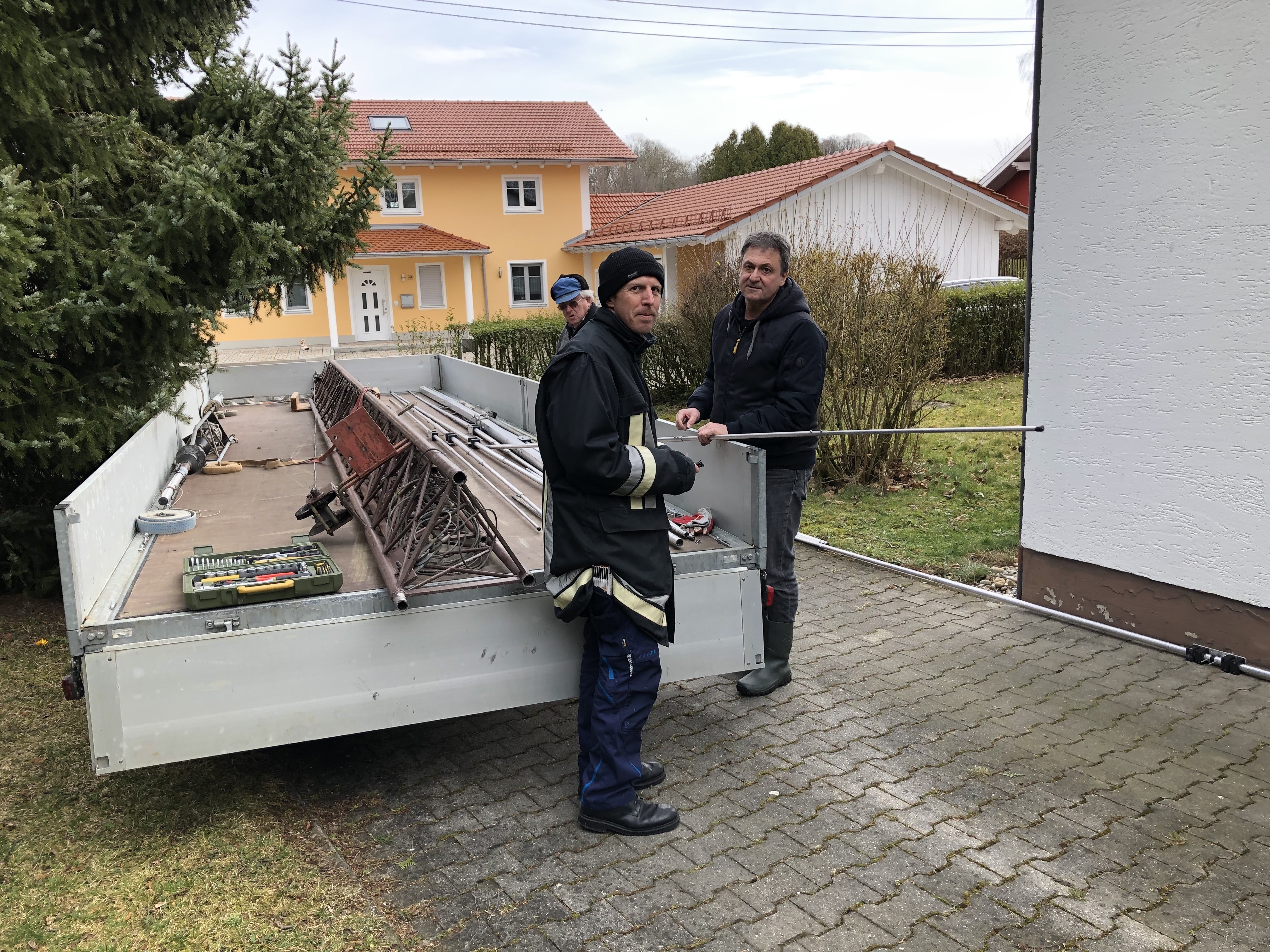 Schon früh am Samstagmorgen machten sich die OMs Martin DL5RMH, Andi DL8RBR, Sigi DF9RD und Achim DL3RY, sowie SWL Maxi mit einem 10m langen 2-Achs Drehschemelhänger auf den Weg nach Isen. Die Mannschaft traf dann noch Stephan DL6RDR, der direkt vor Ort gefahren war. Die Herausforderung war, nach Demontage von Antenne und Kopfstück mit Rotor, den 300kg schweren Mast mit den vorhandenen 6 Mann vom 1,8m hohen Mastfuß zu hieven und anschließend zum Anhänger zu tragen. Die Aufgabe wurde bravurös gemeistert und nach Ladungssicherung konnte man sich auf den Heimweg machen. Da Sigi sich schon vorzeitig verabschieden musste, standen zum Abladen nur noch 5 Leute zur Verfügung, aber unter Zuhilfenahme unseres uralten Maurerschubkarrens klappte auch das unfallfrei.