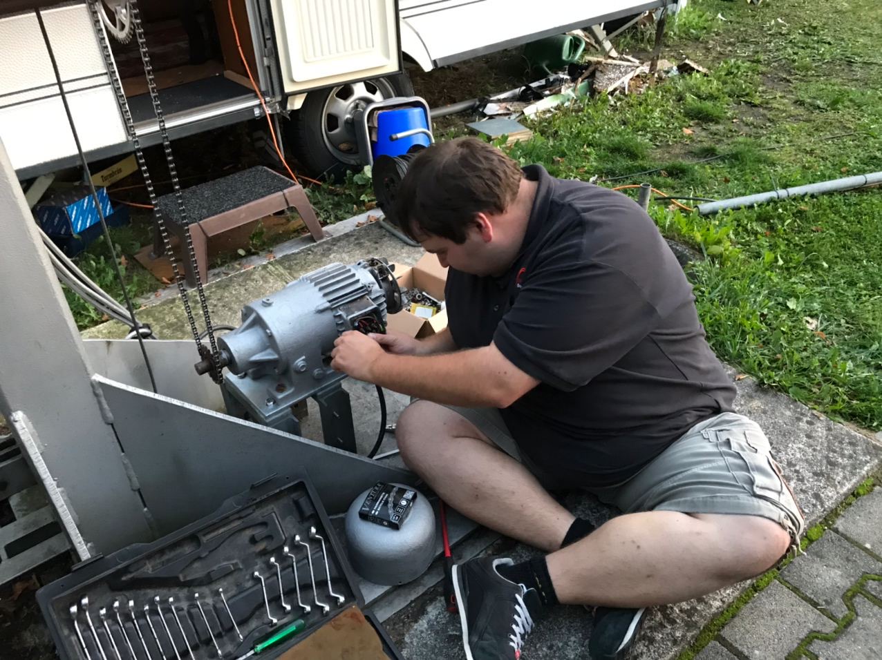 Nachdem ein Team am Samstag den 19.09. den Beam auf Vordermann gebracht, den drehbaren 30/40m Dipol und die 2m Yagi aufgebaut hatte, konnten die Antennen am Samstag den 03.10. am Mast montiert werden. Vorher waren noch etliche „Kleinigkeiten“ wie, Montage des Mastkopfes, des Rotors, des Oberlagers, sowie des Antennen-Trägerrohres zu erledigen. Die Arbeiten am Mast werden nun durch die Elektrifizierung deutlich erleichtert. Das Auf- und Abkurbeln, sowie das Kippen des Mastes wird jetzt durch 2 Elektromotoren und einer entsprechenden Steuerung erledigt, alles abgesichert durch Endlagenschalter.