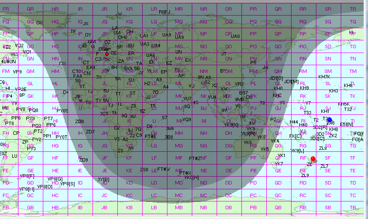 Grayline-Situation beim QSO mit JA3YBK über ca. 9100 km. Bei JA3YBK war es etwa 2 Std. vor Sonnenaufgang.