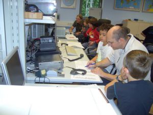 Die nächste Gruppe durfte gleich an die Funkstationen. In Betrieb waren die UKW-, als auch die Kurzwellenstation. Von beiden Funkplätzen aus konnte man die riesigen Antennen hoch oben auf dem Gittermast drehen um ein optimales Signal mit dem Gesprächspartner zu ermöglichen. War es schon toll, dass man an der UKW-Station Gesprächspartner aus der näheren Gegend, z.B. Landshut, aber auch aus dem Bayrischen Wald und Österreich erreichen konnte, so war es besonders aufregend, wenn auf Kurzwelle plötzlich auch englisch sprechende Funkpartner erreicht werden konnten. Der Englisch-Unterricht war plötzlich wichtig und nicht nur trockene Lernmaterie. Einige Mutige trauten sich aber und wurden mit einer Verbindung bis nach Australien belohnt. Das gibt Gesprächsstoff nach den Ferien in der Klasse.