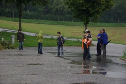 Die dritte Gruppe hatte anfänglich etwas Pech mit dem Wetter. Es war die Gruppe um Mathias, DC1RO, der den Jugendlichen im Gelände um den SC Berg einige kleine Sender versteckt hatte, die es nun mittels Peilempfänger zu finden galt. Im TV, wenn z.B. bei Tiersendungen die Forscher „ihre“ Tiere, denen ein Funkhalsband verpaßt wurde, anpeilen und auch gleich finden, sieht das Ganze natürlich kinderleicht aus. Selbst einmal auf Peiljagd gehen ist aber dann eben doch nicht ganz so einfach. Gefunden wurden aber alle Sender. Jetzt werden die jungen Leute solche Sendungen vielleicht etwas fachkundiger betrachten.